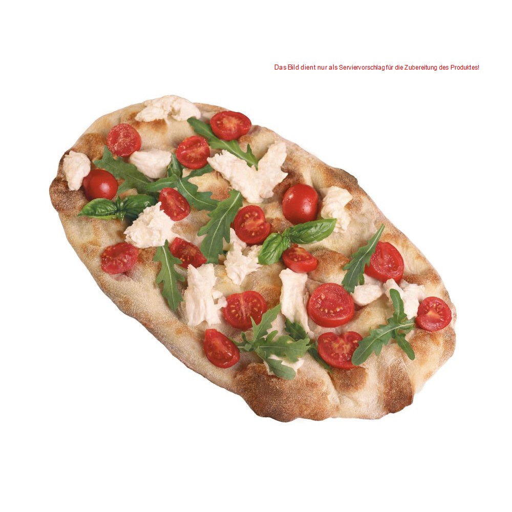 Dieser exquisite Pinsa-Boden im klassischen ovalen Format zeichnet sich durch seine ausgeprägte Vielseitigkeit aus: Er kann gefüllt, als einfache Focaccia verwendet werden, perfekt zum Aperitif oder auch als Dessert.